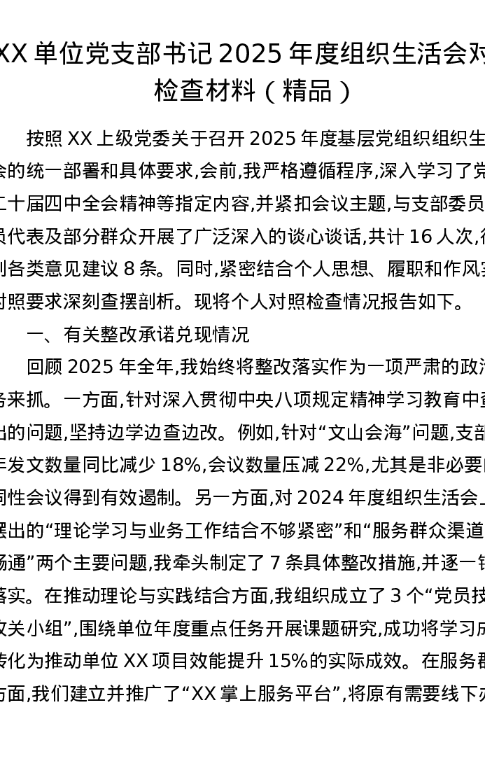 XX单位党支部书记2025年度组织xxx对照检查材料