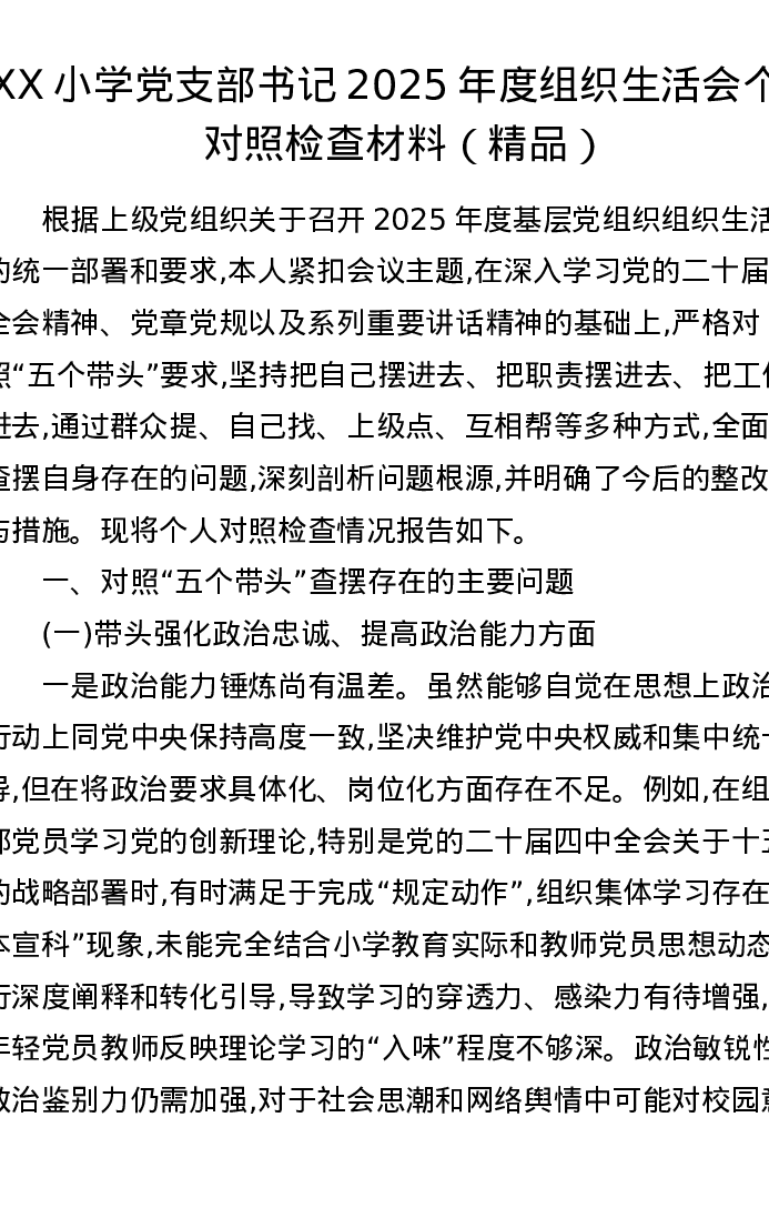 XX小学党支部书记2025年度组织xxx个人对照检查材料
