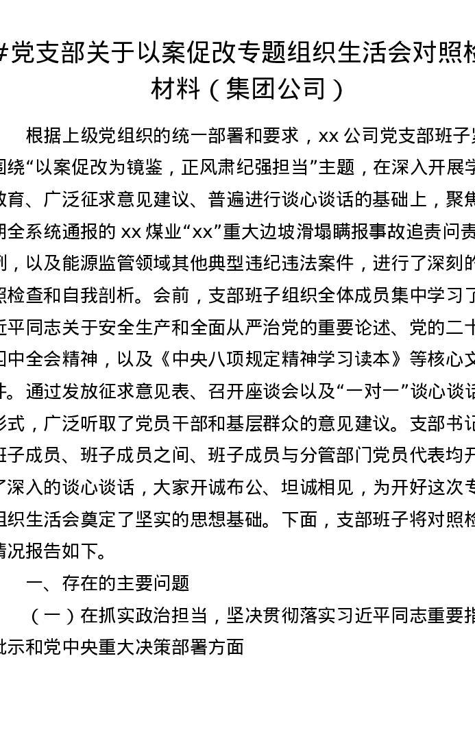 党支部关于以案促改专题组织xxx对照检查材料(集团公司)
