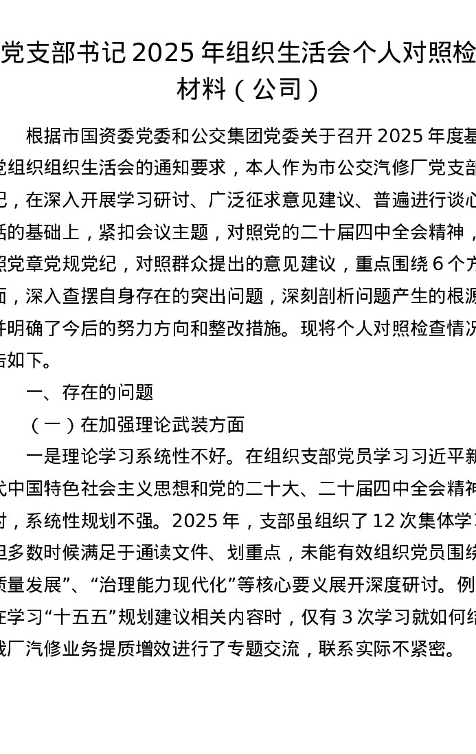 党支部书记2025年组织xxx个人对照检查材料(公司)