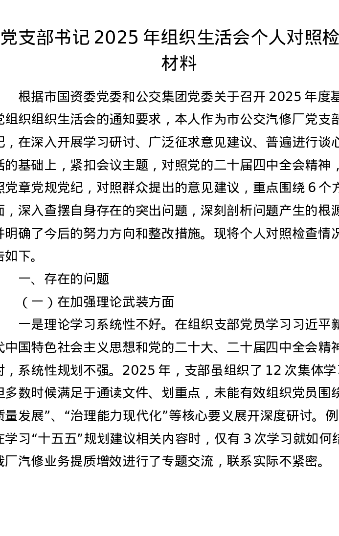 党支部书记2025年组织xxx个人对照检查材料