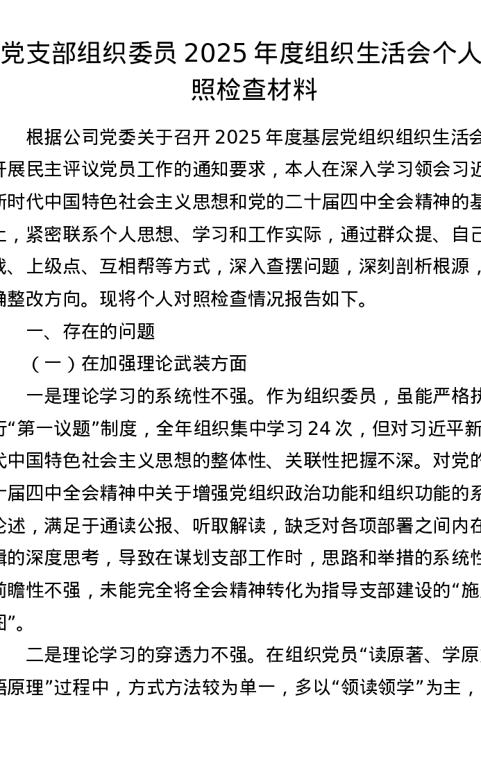 党支部组织委员2025年度组织xxx个人对照检查材料