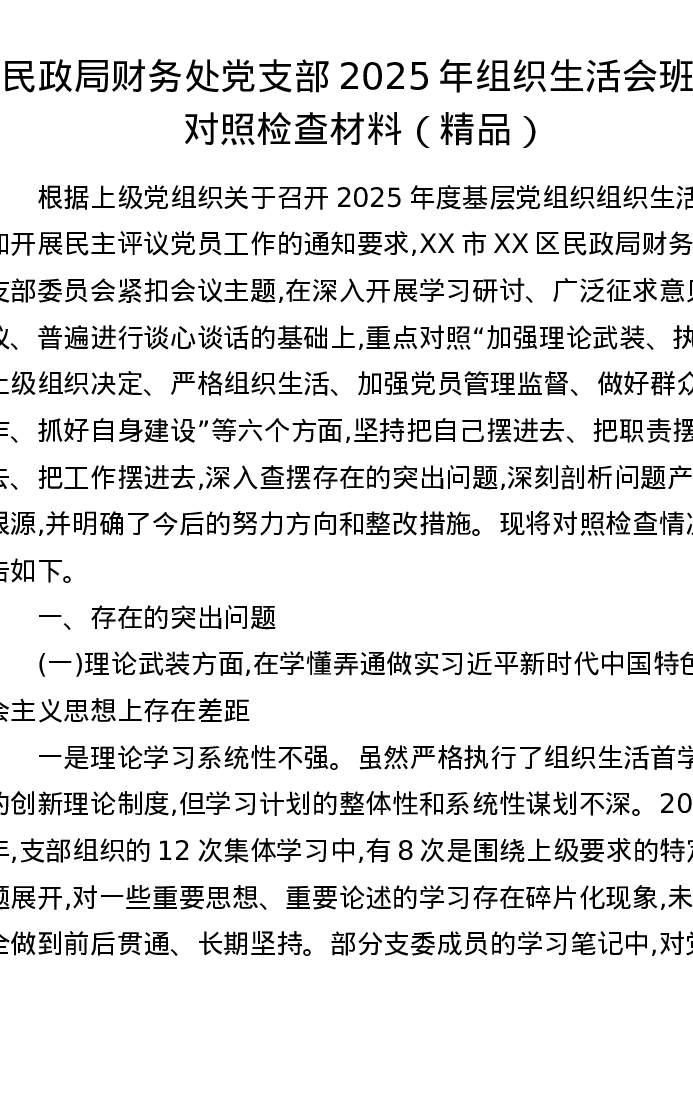 民政局财务处党支部2025年组织xxx班子对照检查材料