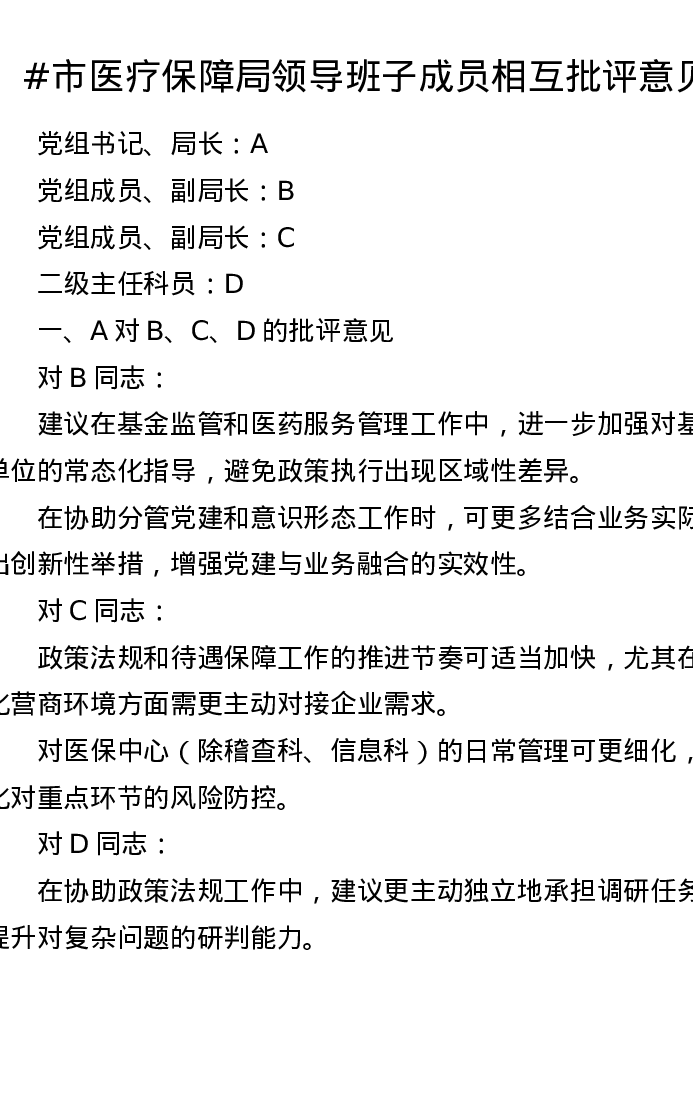 市医疗保障局领导班子成员相互批评意见