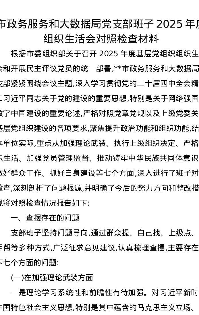 市政务服务和大数据局党支部班子2025年度组织xxx对照检查材料