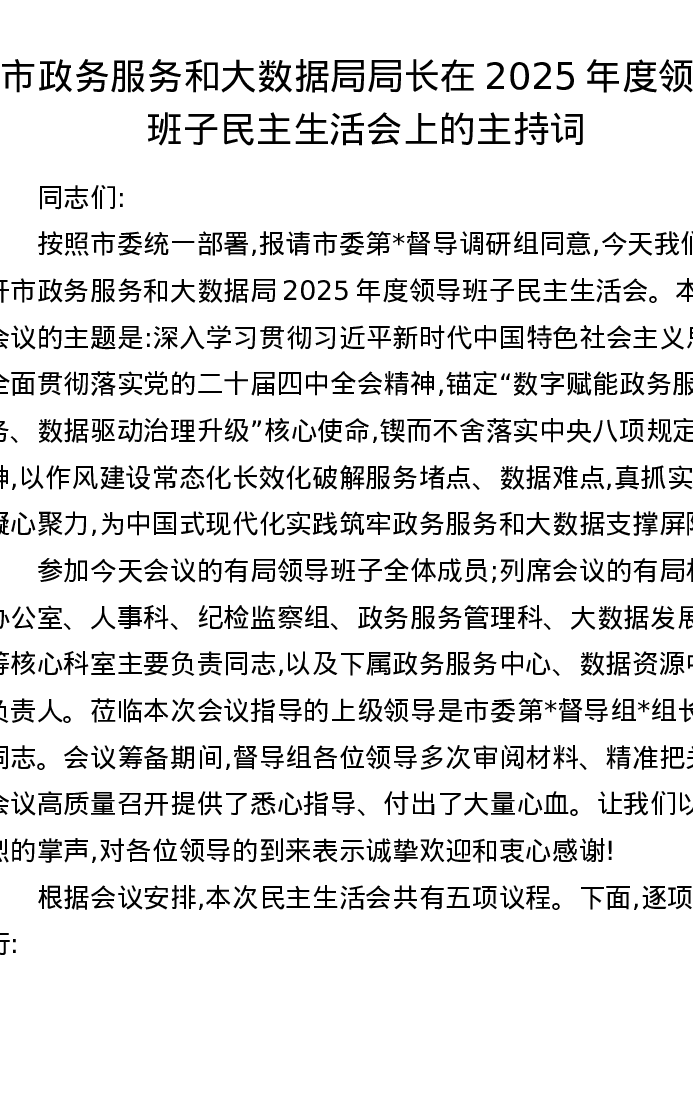 市政务服务和大数据局局长在2025年度领导班子xxxxx上的主持词