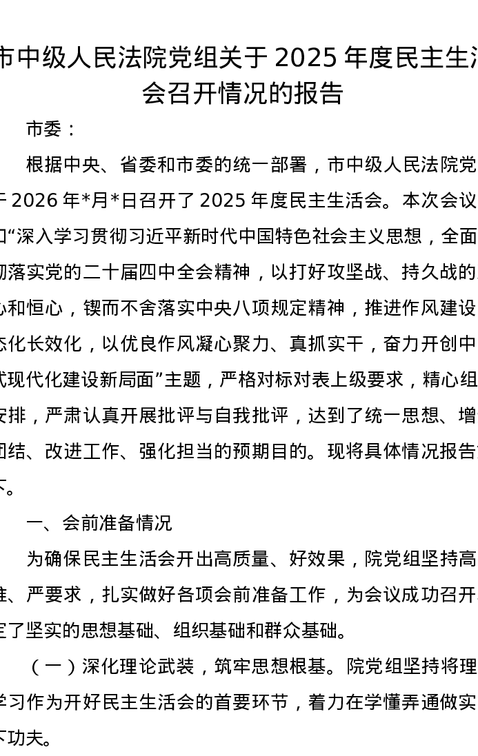 市中级人民法院党组关于2025年度xxxxx召开情况的报告