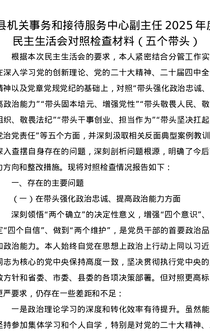 县机关事务和接待服务中心副主任2025年度xxxxx对照检查材料(五个带头)