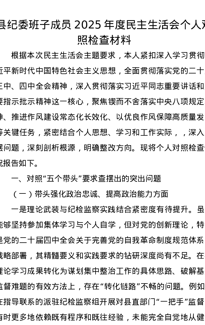 县纪委班子成员2025年度xxxxx个人对照检查材料