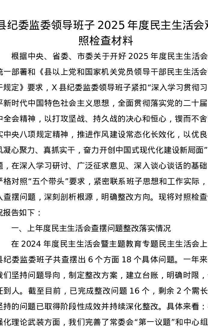 县纪委监委领导班子2025年度xxxxx对照检查材料