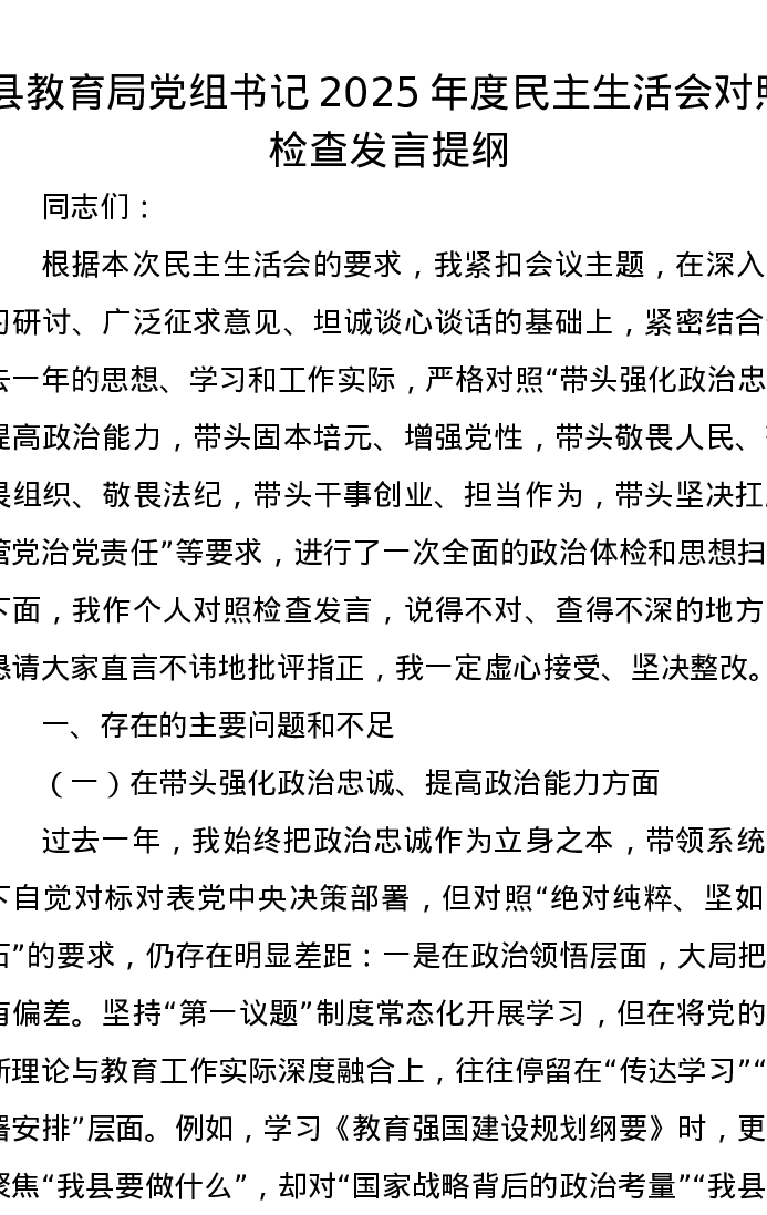 县教育局党组书记2025年度xxxxx对照检查发言提纲
