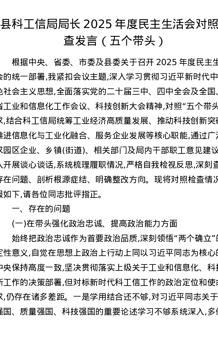 县科工信局局长2025年度xxxxx对照检查发言(五个带头)