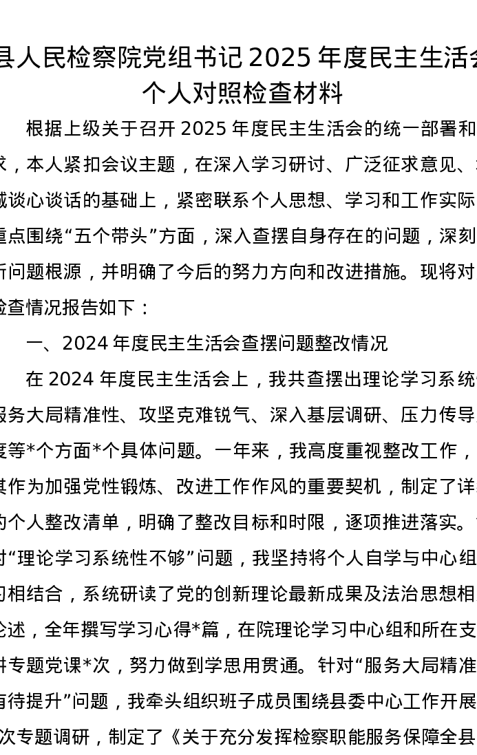 县人民检察院党组书记2025年度xxxxx个人对照检查材料