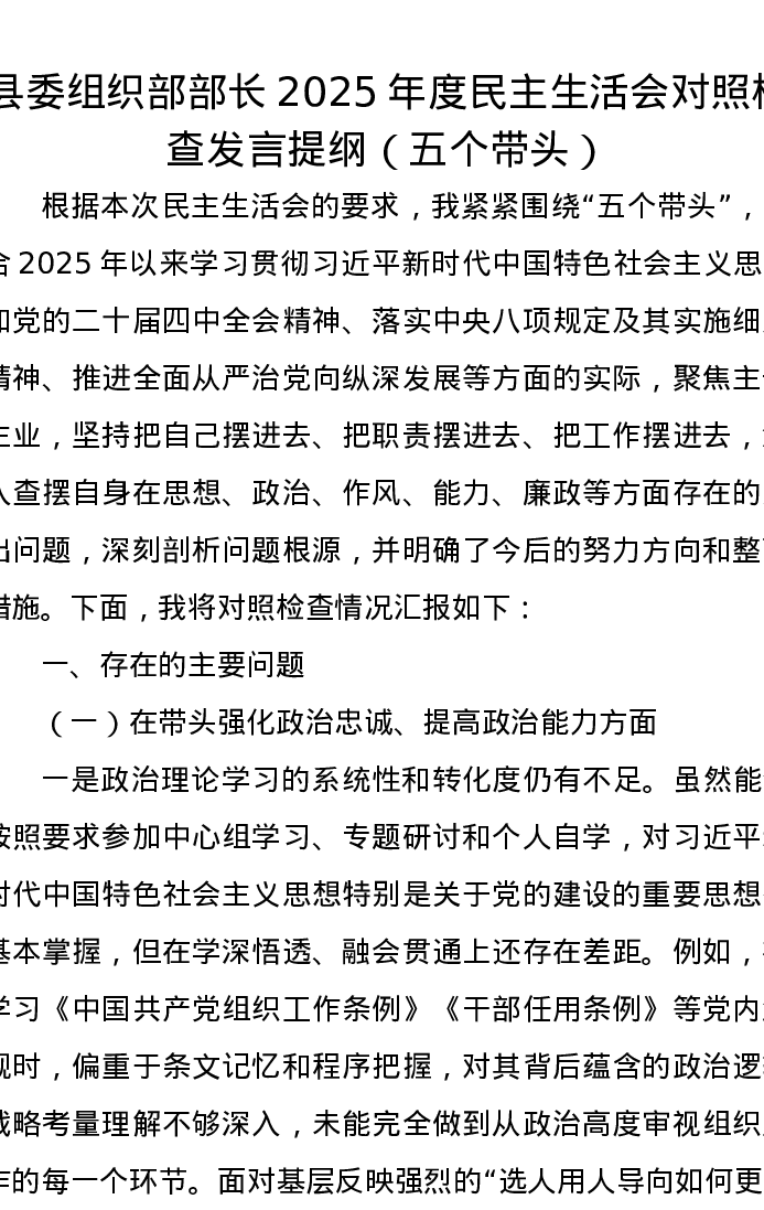 县委组织部部长2025年度xxxxx对照检查发言提纲(五个带头)