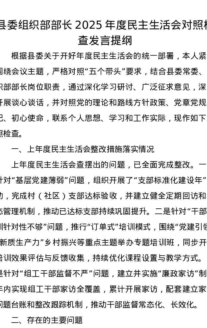 县委组织部部长2025年度xxxxx对照检查发言提纲