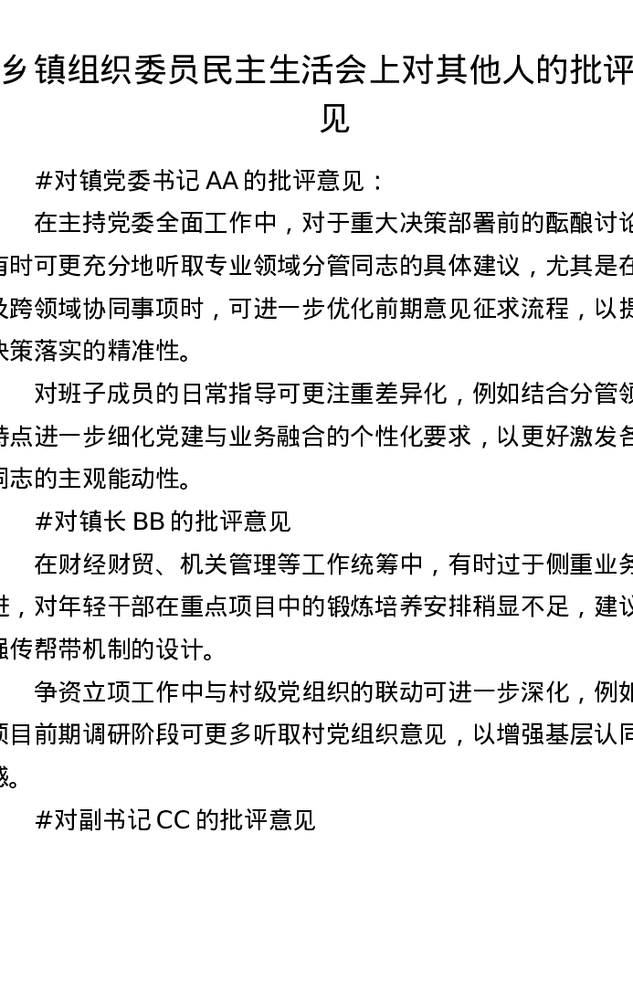 乡镇组织委员xxxxx上对其他人的批评意见(1108字)