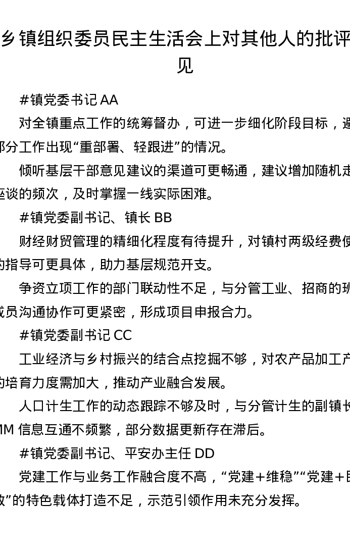 乡镇组织委员xxxxx上对其他人的批评意见(971字)