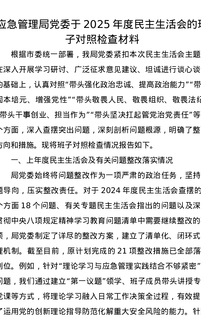 应急管理局党委于2025年度xxxxx的班子对照检查材料