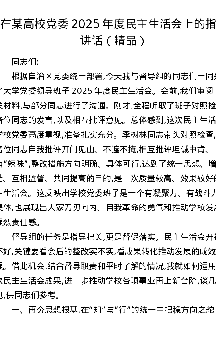 在某高校党委2025年度xxxxx上的指导讲话