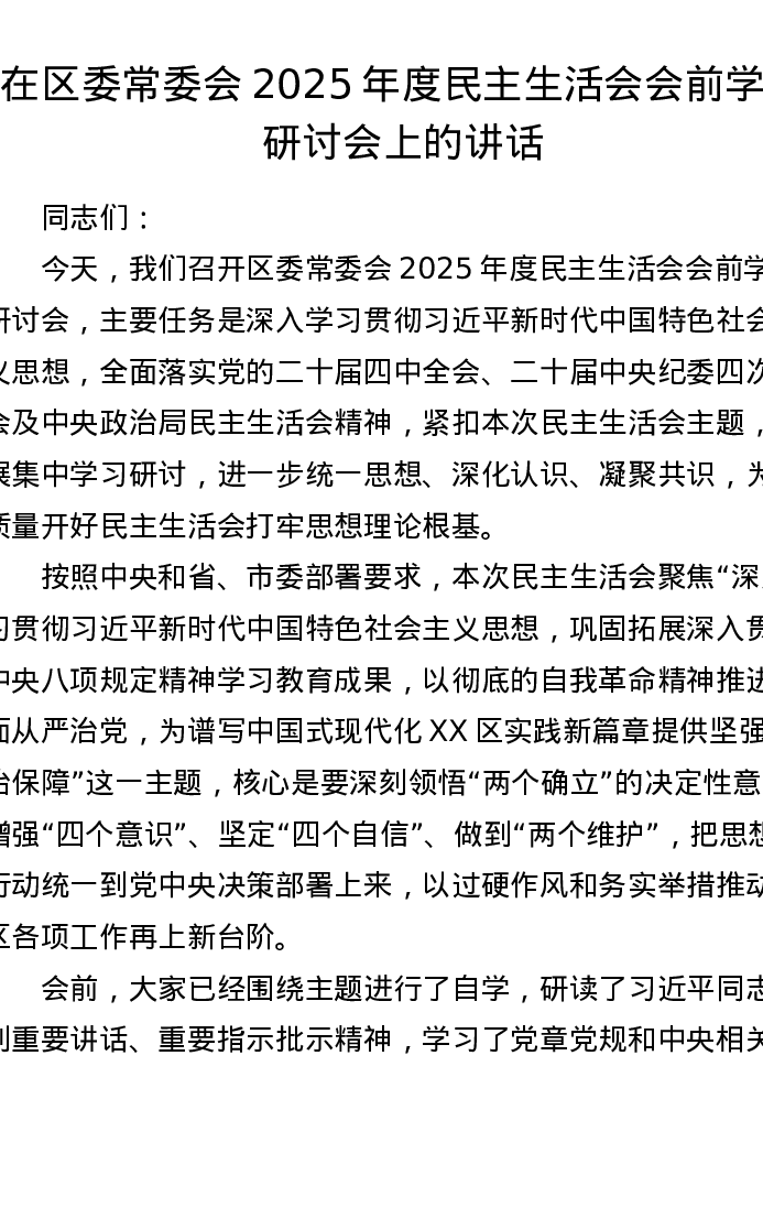 在区委常委会2025年度xxxxx会前学习研讨会上的讲话