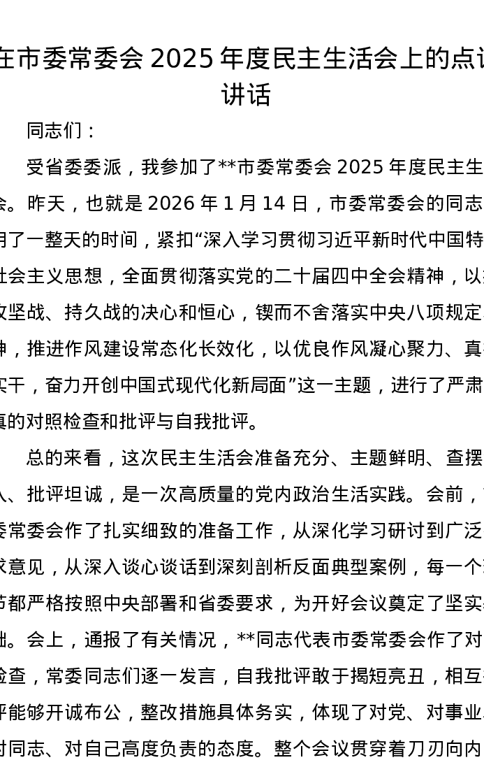 在市委常委会2025年度xxxxx上的点评讲话