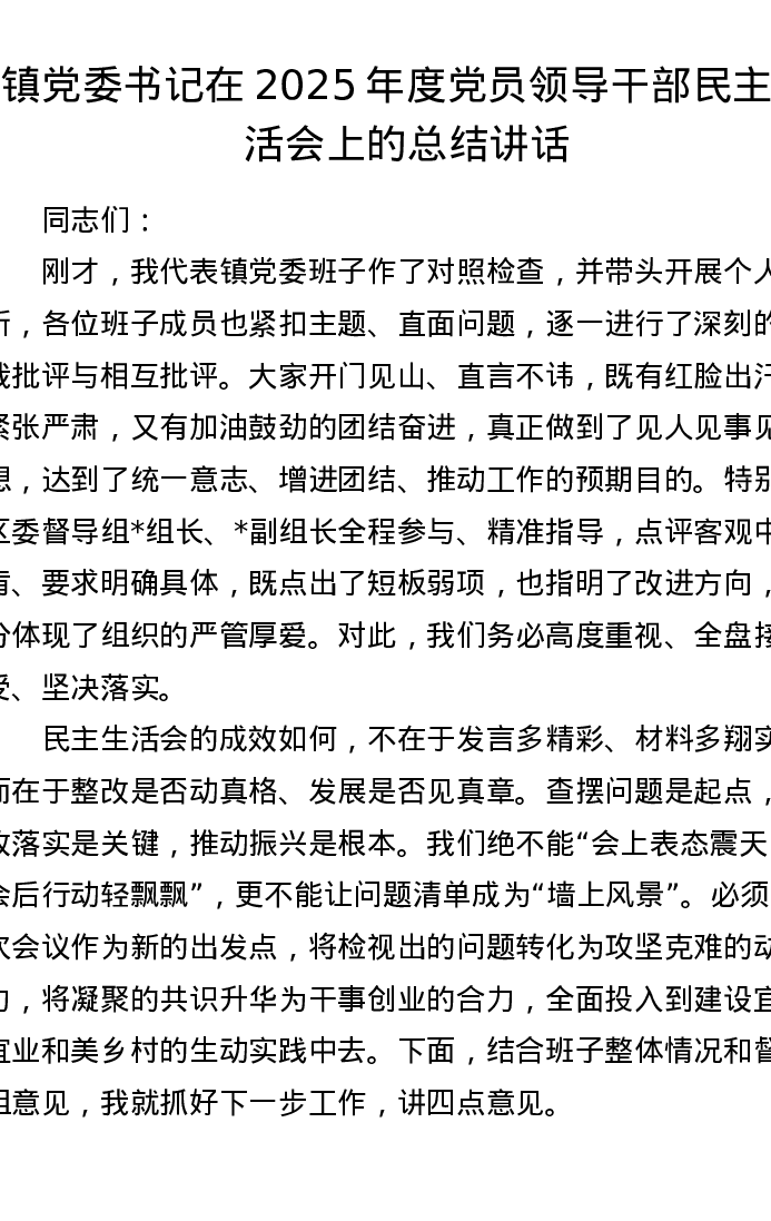 镇党委书记在2025年度党员领导干部xxxxx上的总结讲话
