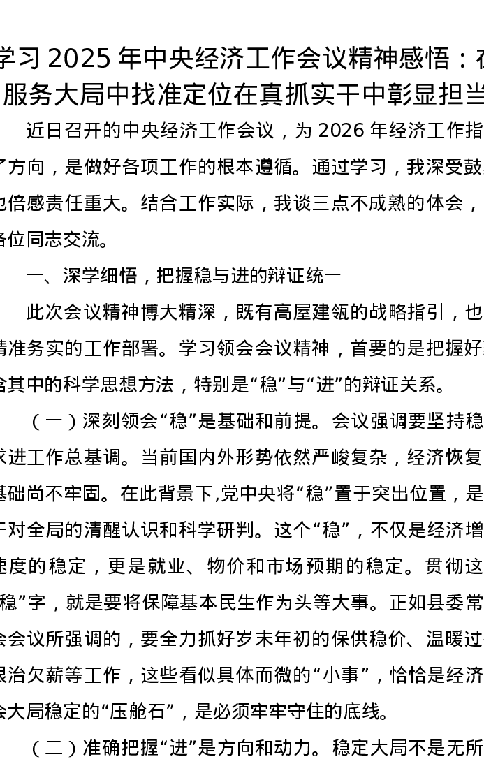 学习2025年中央经济工作会议精神感悟:在服务大局中找准定位在真抓实干中彰显担当