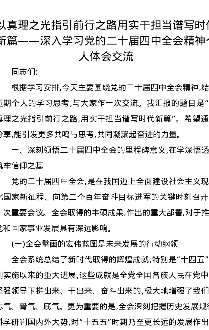以真理之光指引前行之路用实干担当谱写时代新篇——深入学习党的二十届四中全会精神个人体会交流发言