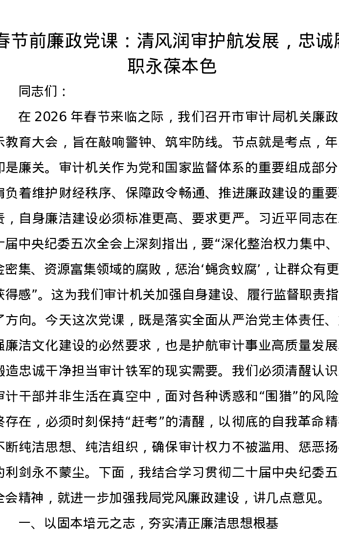 春节前廉政党课:清风润审护航发展,忠诚履职永葆本色