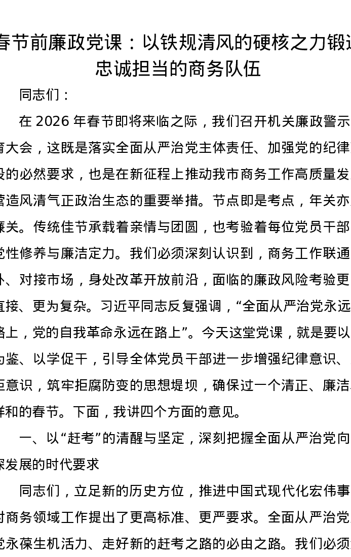 春节前廉政党课:以铁规清风的硬核之力锻造忠诚担当的商务队伍