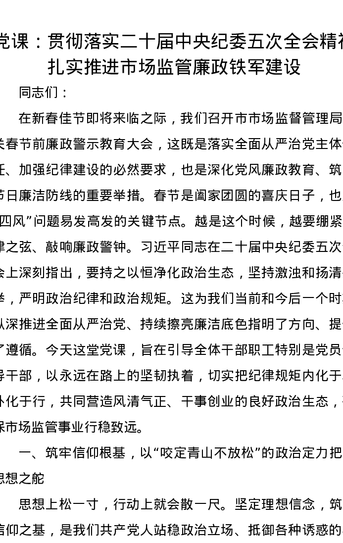 党课:贯彻落实二十届中央纪委五次全会精神 扎实推进市场监管廉政铁军建设