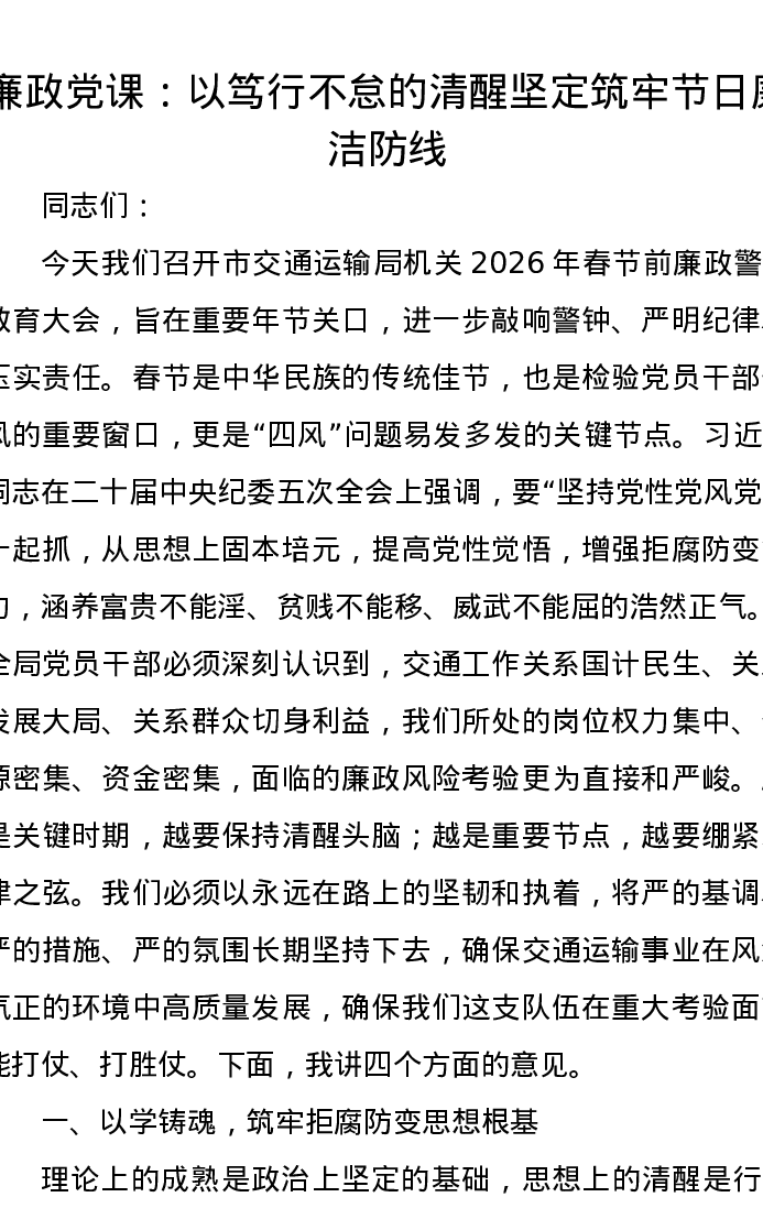 廉政党课:以笃行不怠的清醒坚定筑牢节日廉洁防线