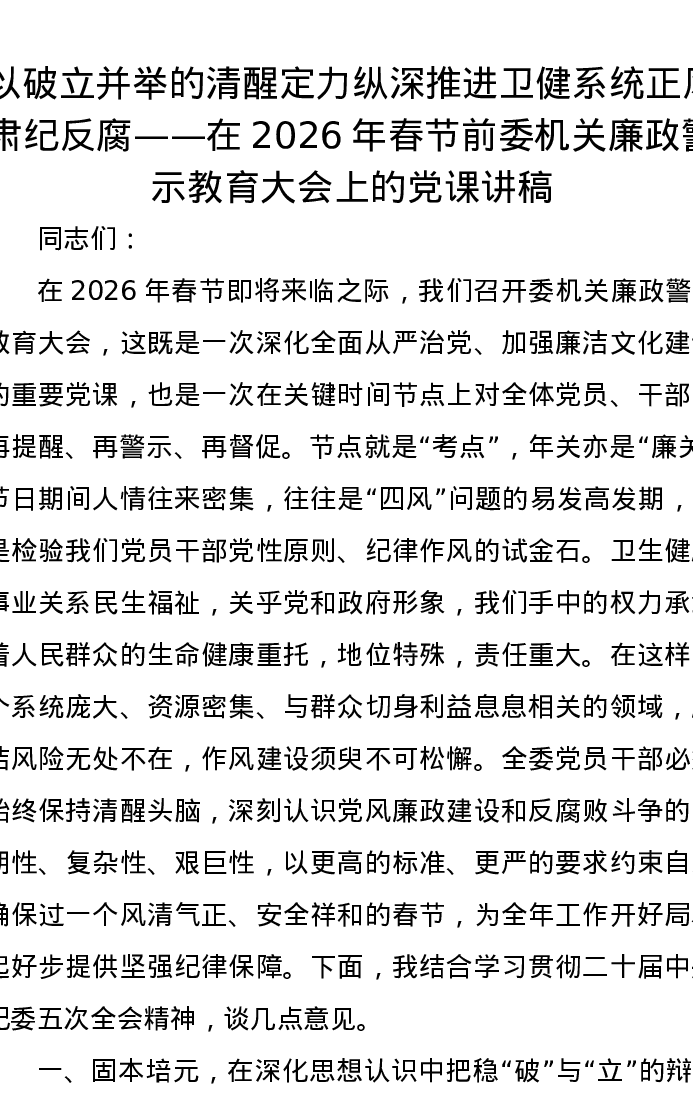 以破立并举的清醒定力纵深推进卫健系统正风肃纪反腐——在2026年春节前委机关廉政警示教育大会上的党课讲稿