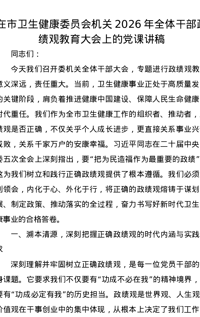 在市卫生健康委员会机关2026年全体干部政绩观教育大会上的党课讲稿