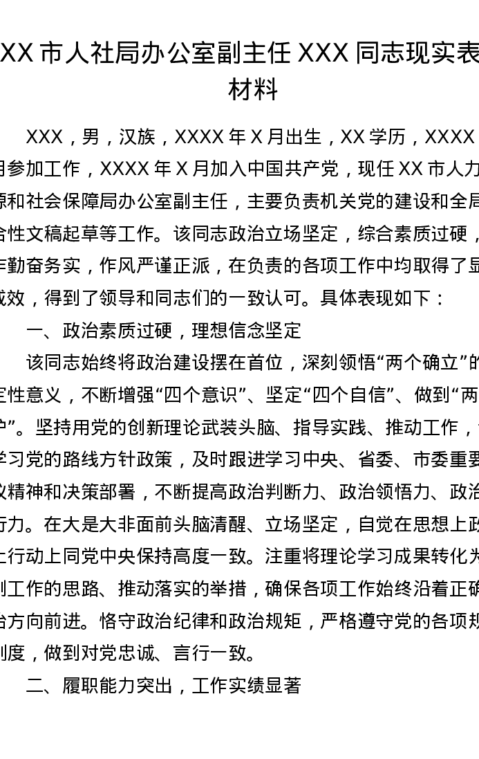 XX市人社局办公室副主任XXX同志现实表现材料1