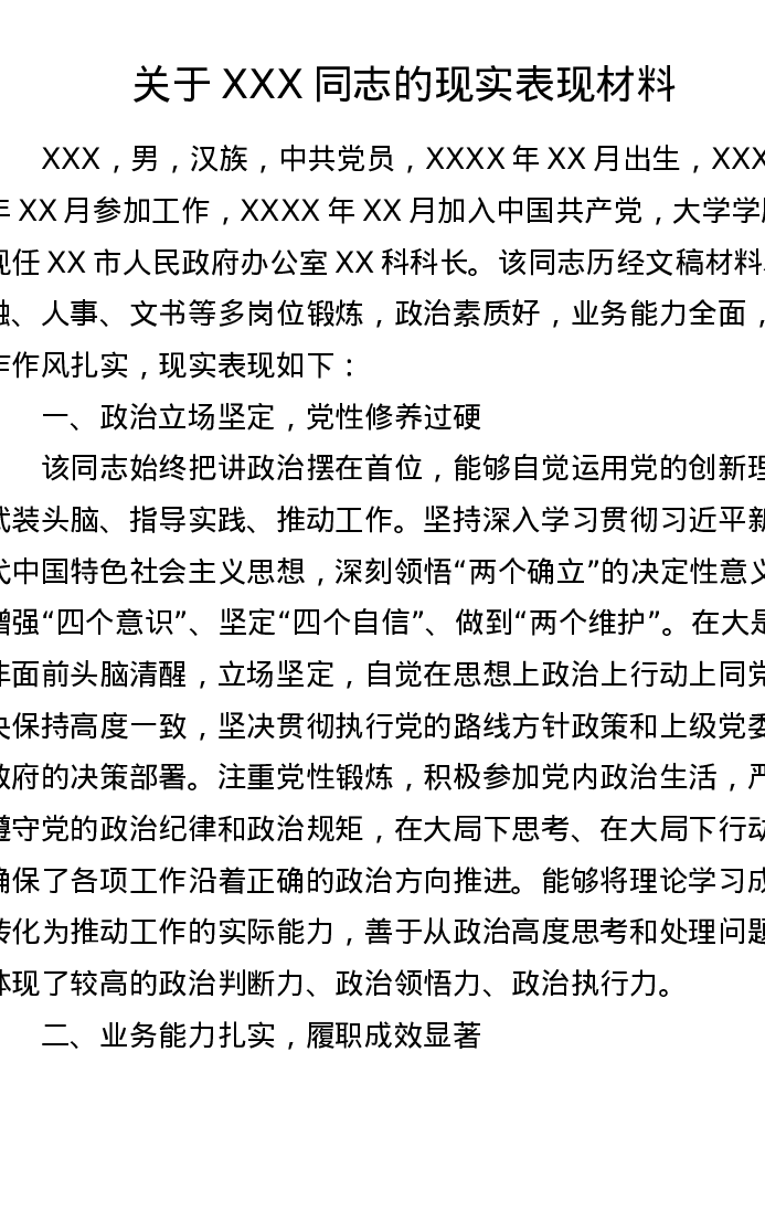 关于XXX同志的现实表现材料