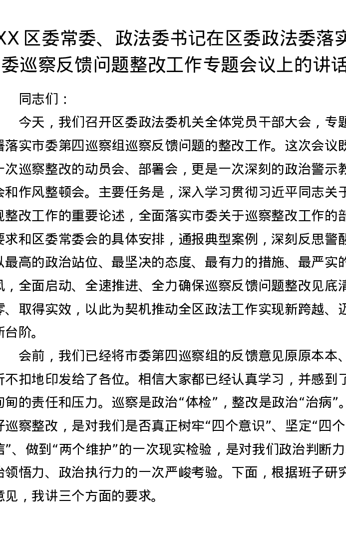 XX区委常委、政法委书记在区委政法委落实市委巡察反馈问题整改工作专题会议上的讲话2