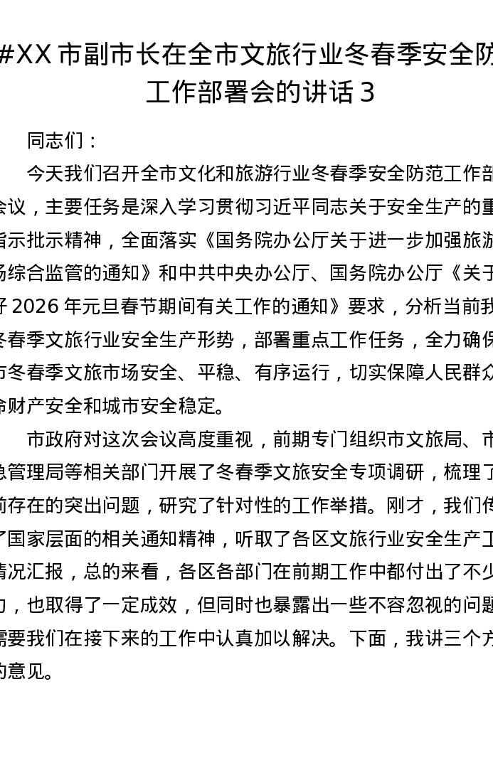 XX市副市长在全市文旅行业冬春季安全防范工作部署会的讲话3