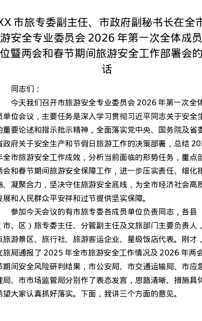 XX市旅专委副主任、市政府副秘书长在全市旅游安全专业委员会2026年第一次全体成员单位暨两会和春节期间旅游安全工作部署会的讲话