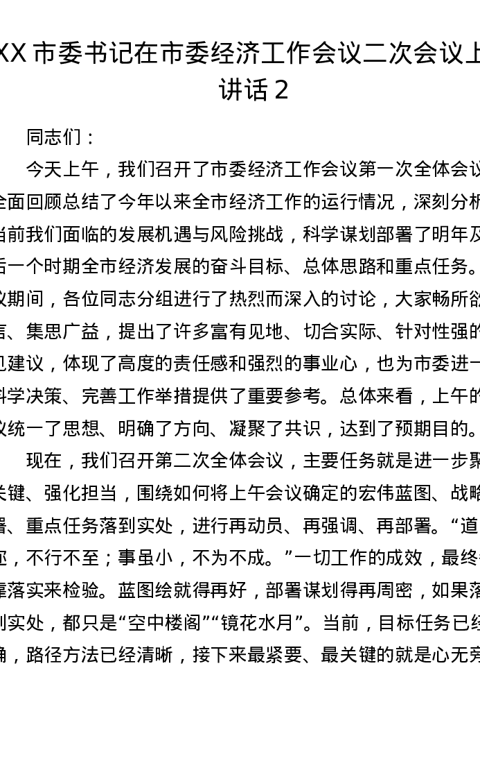 XX市委书记在市委经济工作会议二次会议上的讲话2