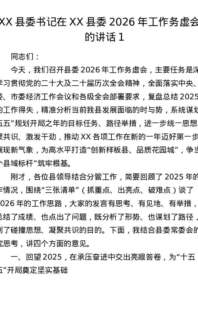 XX县委书记在XX县委2026年工作务虚会上的讲话1