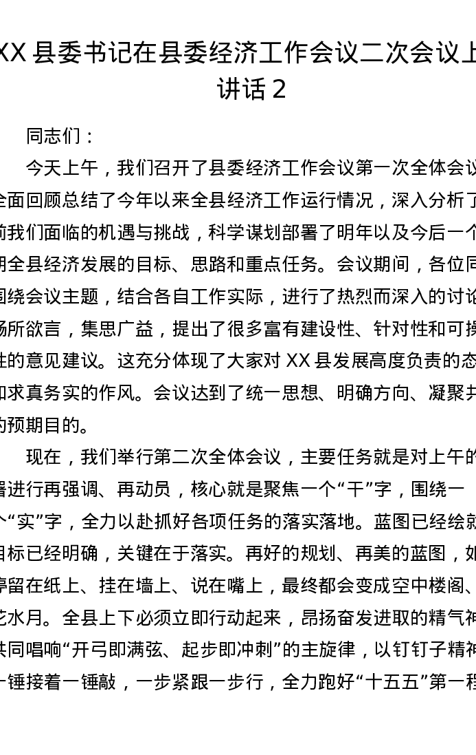 XX县委书记在县委经济工作会议二次会议上的讲话2