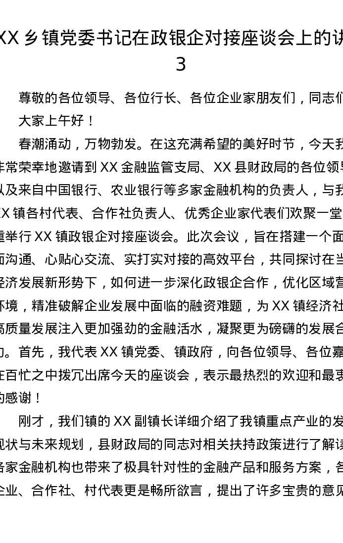 XX乡镇党委书记在政银企对接座谈会上的讲话3