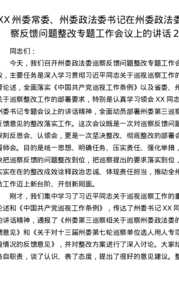 XX州委常委、州委政法委书记在州委政法委巡察反馈问题整改专题工作会议上的讲话2