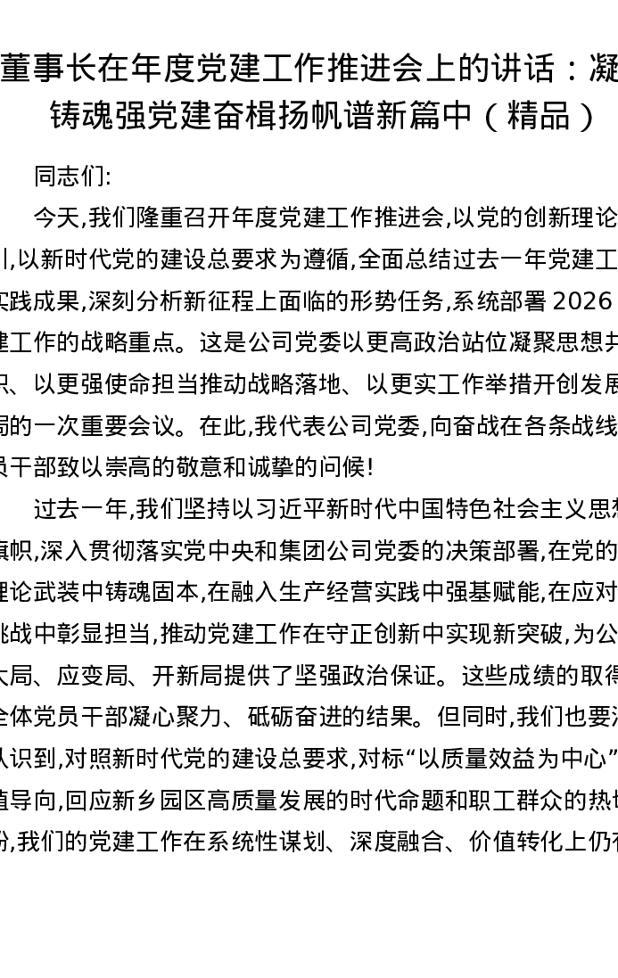 董事长在年度党建工作推进会上的讲话:凝心铸魂强党建 奋楫扬帆谱新篇中