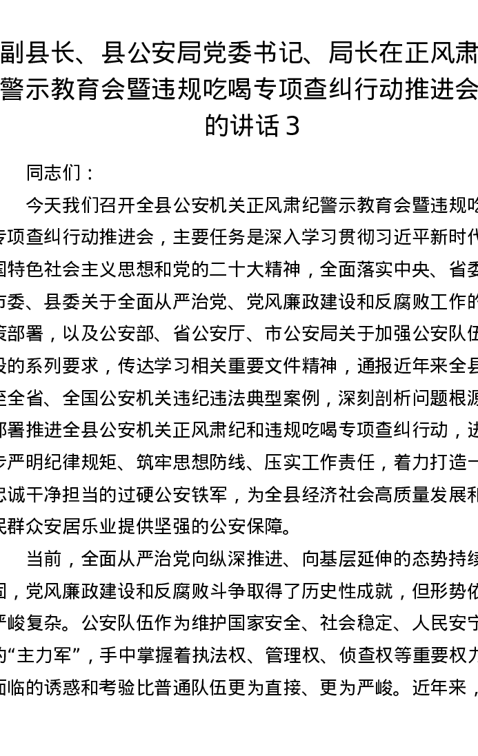副县长、县公安局党委书记、局长在正风肃纪警示教育会暨违规吃喝专项查纠行动推进会上的讲话3