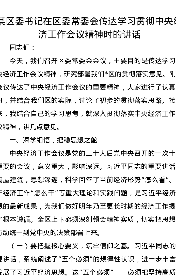 某区委书记在区委常委会传达学习贯彻中央经济工作会议精神时的讲话