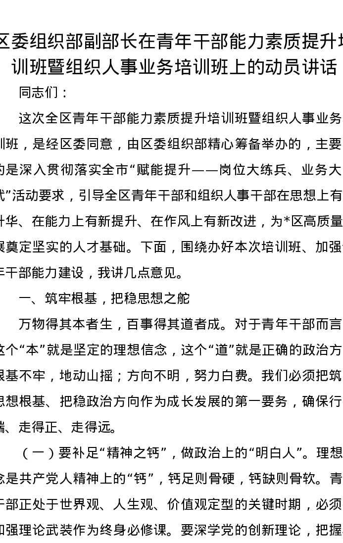 区委组织部副部长在青年干部能力素质提升培训班暨组织人事业务培训班上的动员讲话