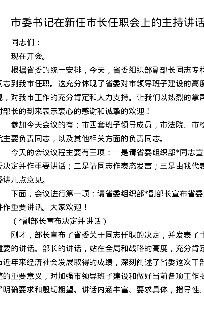市委书记在新任市长任职会上的主持讲话