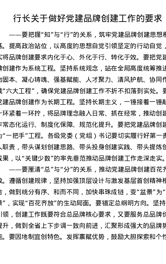 银行行长关于做好党建品牌创建工作的要求